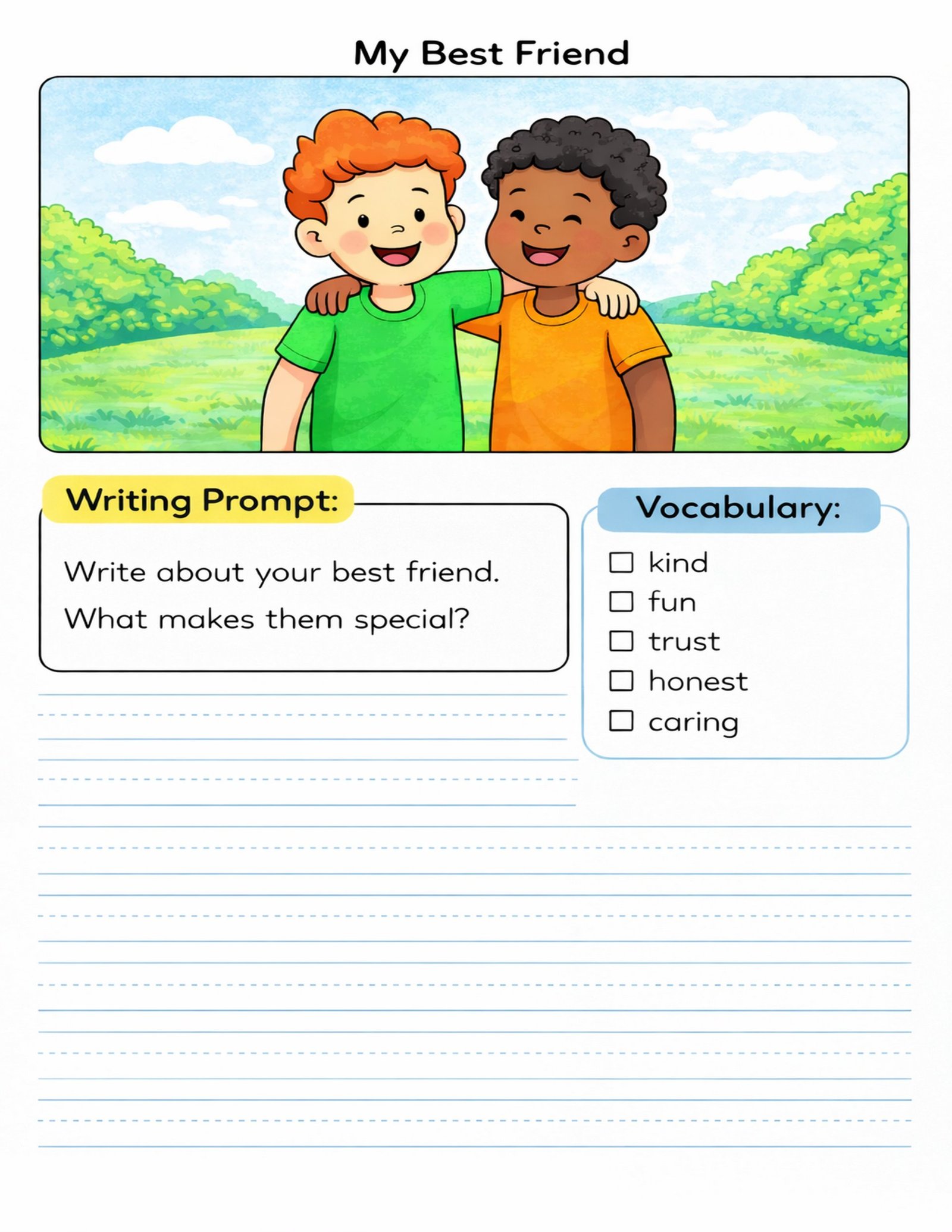 This resource helps students build confidence, creativity, empathy, and writing fluency in a structured and engaging way.