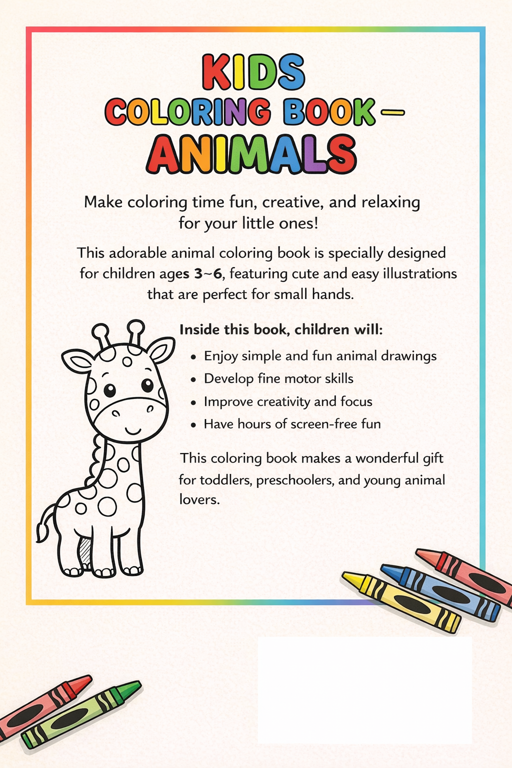 A fun and relaxing animals coloring book specially designed for kids ages 3-6!